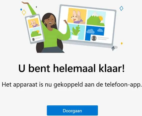 - Op je computer zie je nu ‘U bent helemaal klaar! Het apparaat is nu gekoppeld aan de telefoon-app.’ Klik op ‘Doorgaan’.