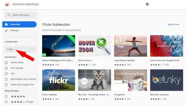 Je kunt bijvoorbeeld in deze zoekbalk diverse filters selecteren, zoals ‘Gratis’, ‘Beschikbaar voor Android’, of ‘Kan offline worden uitgevoerd’. Ook kun je extensies selecteren op beoordeling en zie je in een oogopslag welke extensies het best beoordeeld zijn op dit moment. Na verloop van tijd zal de Store ook enige aanbevelingen geven naarmate je meerdere extensies hebt gedownload.
