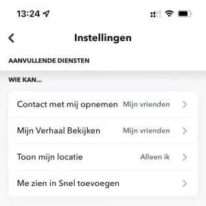 Toon mijn locatie: Snapchat houdt continu je locatie in de gaten en dit kun je eventueel delen met je vrienden. Er zijn vier opties waaruit je kunt kiezen: onzichtbaar, mijn vrienden, Mijn vrienden, behalve of Alleen deze vrienden. Het meest veilig is onzichtbaar, maar wil je toch een paar vrienden mee laten kijken, kies dan voor Alleen deze vrienden en selecteer de vrienden die je 100% vertrouwt.